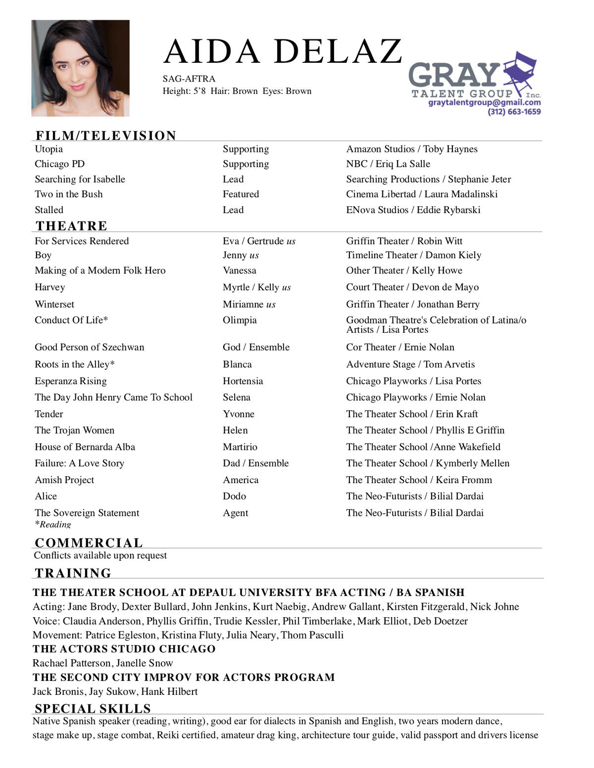 For Film/TV, Theatre, Print, or Voice Over, please contact Gray Talent Group at 312.663.1659 / [email protected]